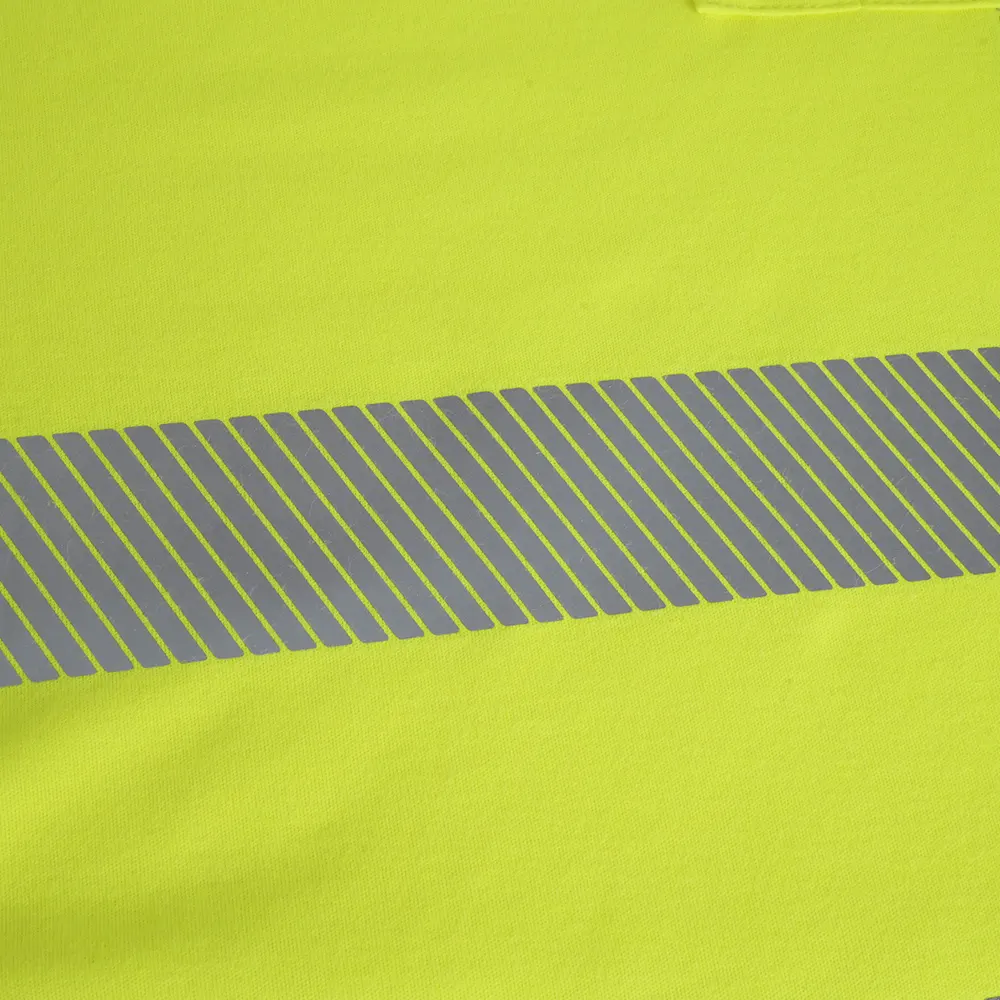 - High visibility: Fluoro-yellow fabric with vertical stripes and 360° reflective bands (hi-vis/hi-viz).